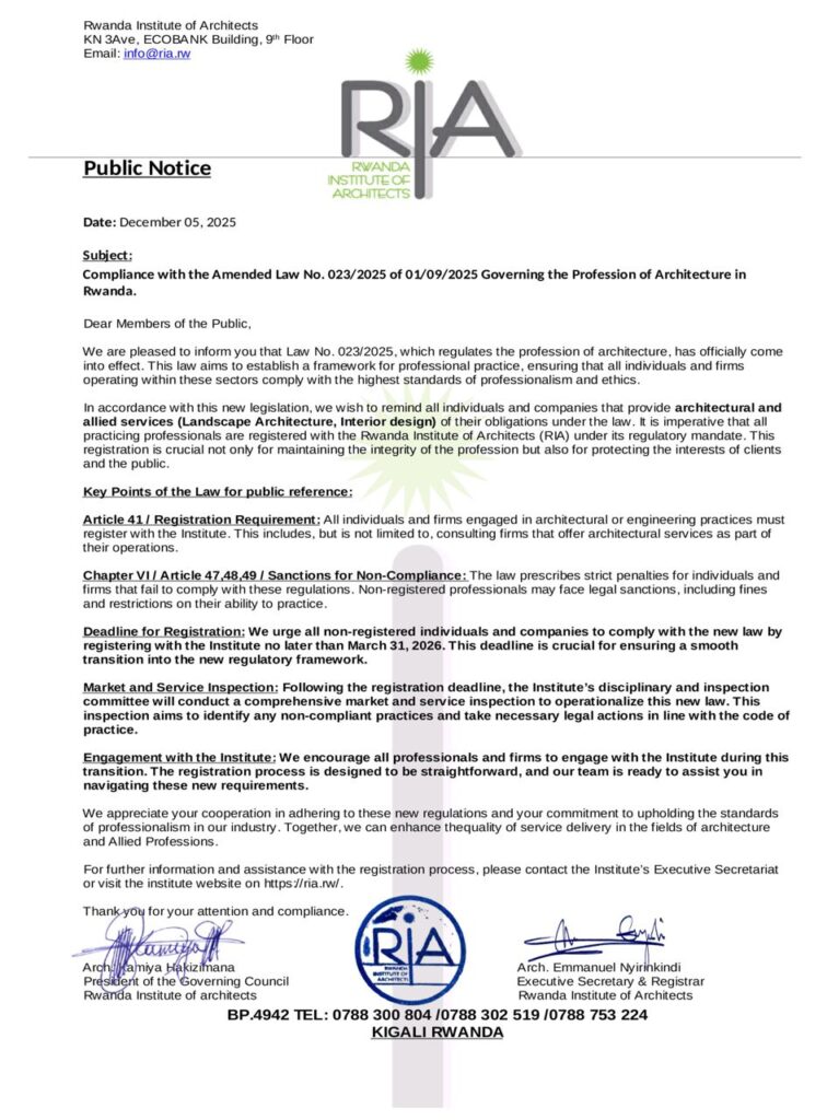 Announcements Public Notice: Compliance with the Amended Law No.023/2025 of Ol/09/2025 Governing the Profession of Architecture in Rwanda. by ria December 6, 2025 written by ria December 6, 2025